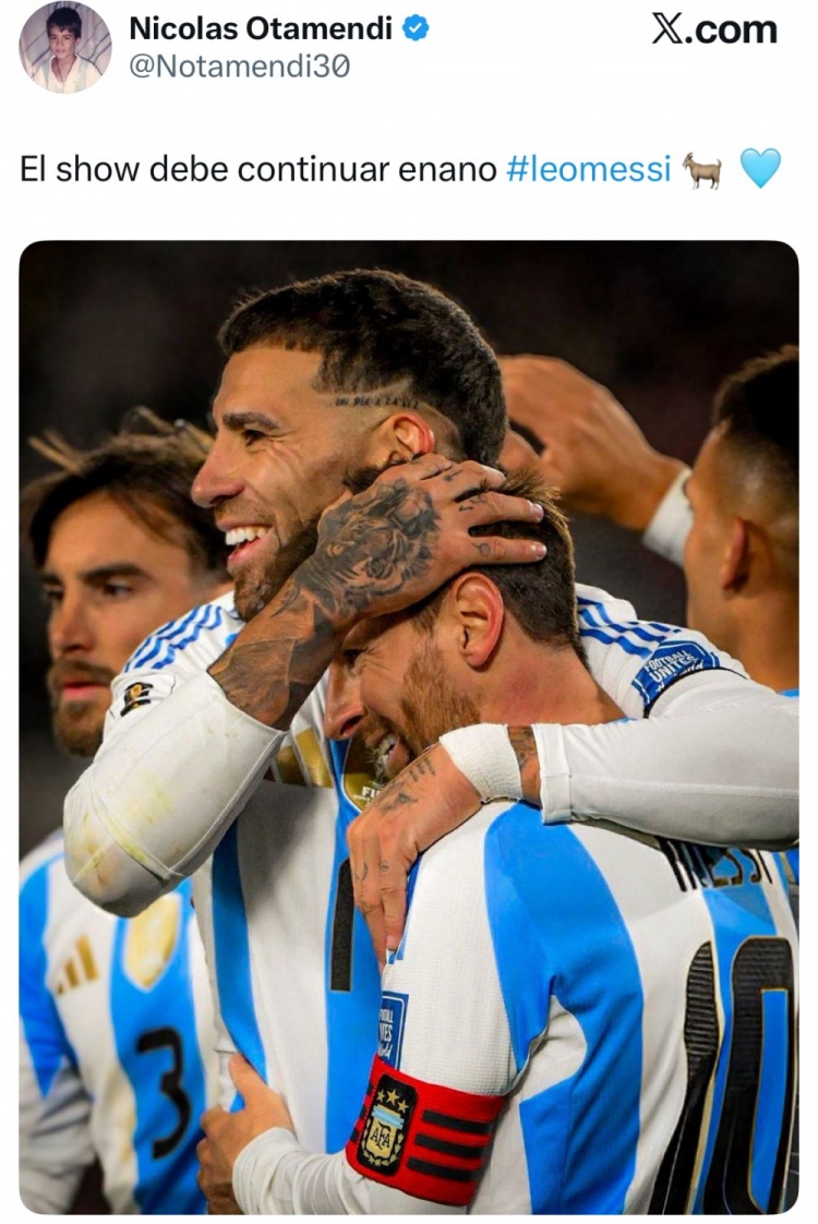 赛后奥塔门迪通过社交媒体发布与梅西相拥庆祝的合影,并配文表示:"继续书写你的传奇篇章吧,史上最佳。"