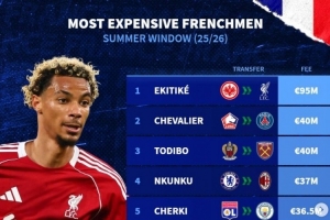 今夏法国球员转会费榜:埃基蒂克9500万,谢尔基&恩昆库&特尔在列